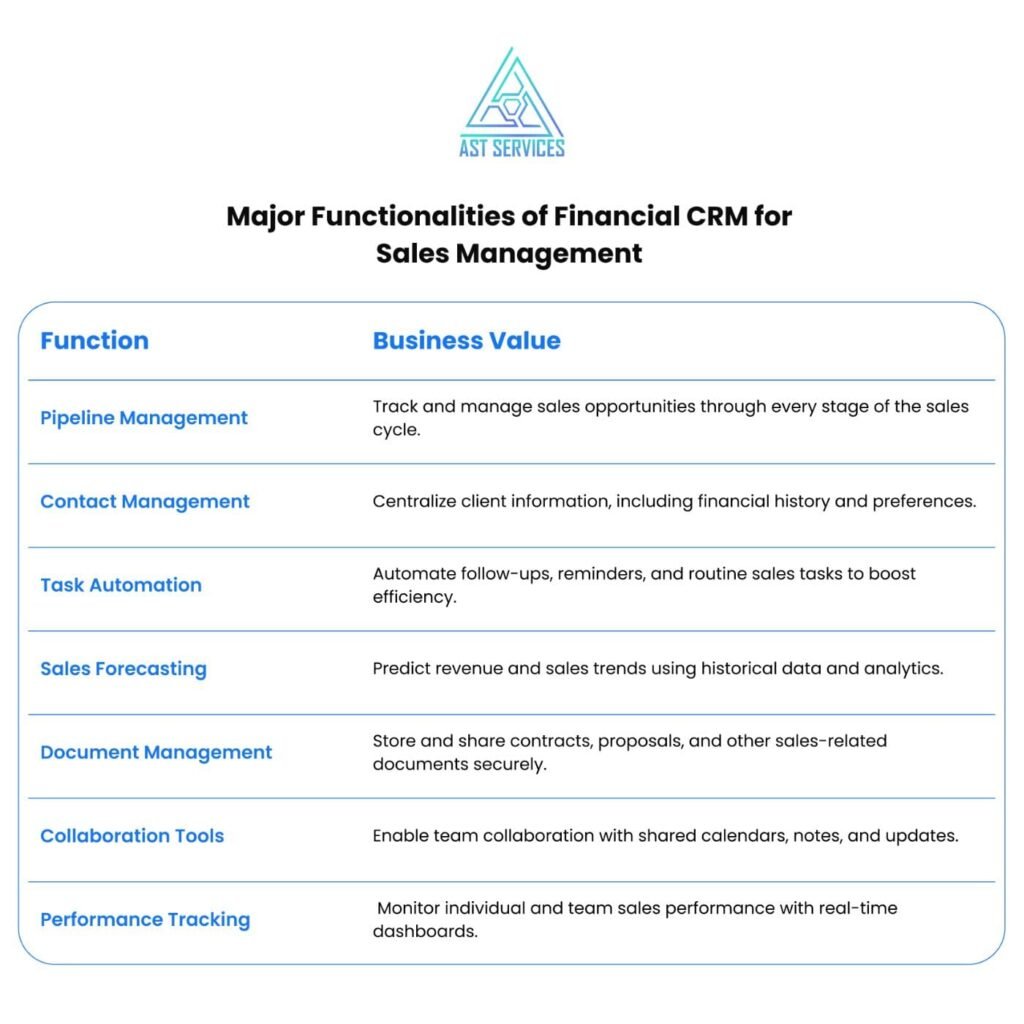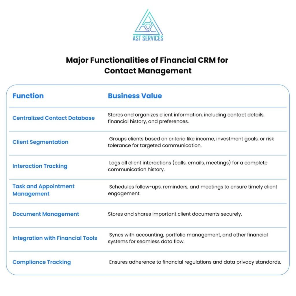 Modern financial CRM platforms deliver functionality across several key domains: