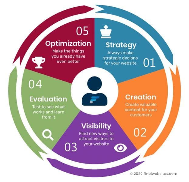 The five phases of the Website Optimization Circle — Strategy, Creation, Visibility, Evaluation, and Optimization — can be applied individually or together to strengthen your website’s performance.